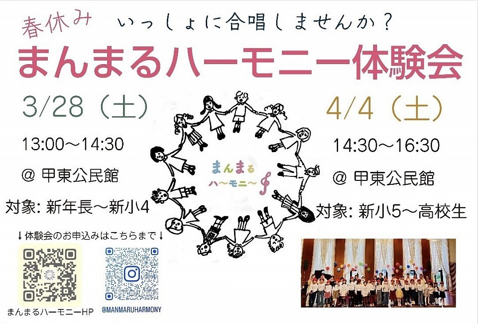 春休みにまんまるハーモニーの体験会を行います。歌が好き、合唱に興味がある、違う学校のお友達を作りたい、ぜひ遊びにいらしてくださいね‼️申し込みは体験フォームかメールでお願いいたします。